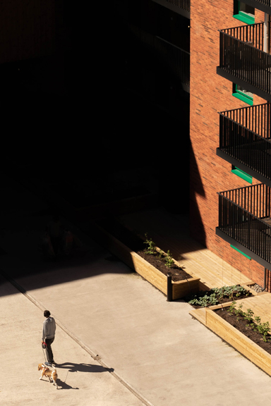 I samsvar med føringer i reguleringsplanen er det lagt vekt på variasjon og visuell oppdeling av volumene. Det har vært en ambisjon å gi prosjektet en varm farge- og materialpalett ved bruk av rødlig tegl kombinert med ubehandlet tre og grønne vindusinnfatninger.