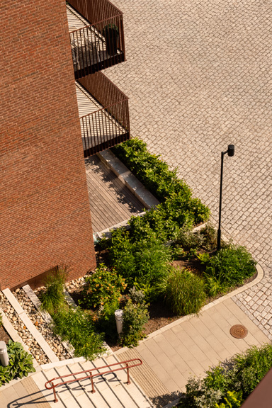 Det er terrengfall langs tre av kvartalets fire sider mot offentlig rom. I tillegg til å jobbe med utadrettede førsteetasjer har vi derfor også lagt ned mye arbeid sammen med landskapsarkitektene i å få til gode overganger mellom førsteetasje og bakkeplan. En åpen og imøtekommende fasade er ivaretatt med store vindusflater fra felleslokaler samt artikulering av bi-innganger og private terrasser. I tillegg er det lagt til rette for tre næringslokaler.